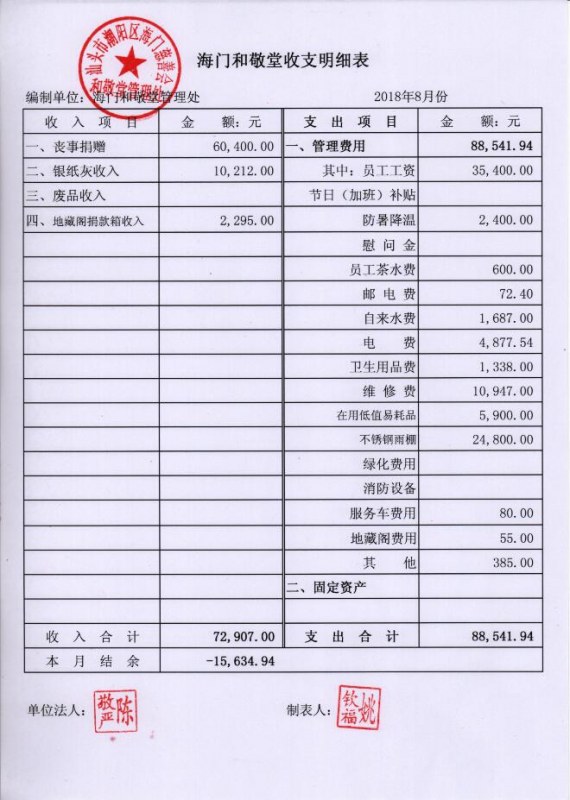 2018年8月份和敬堂收支明细表