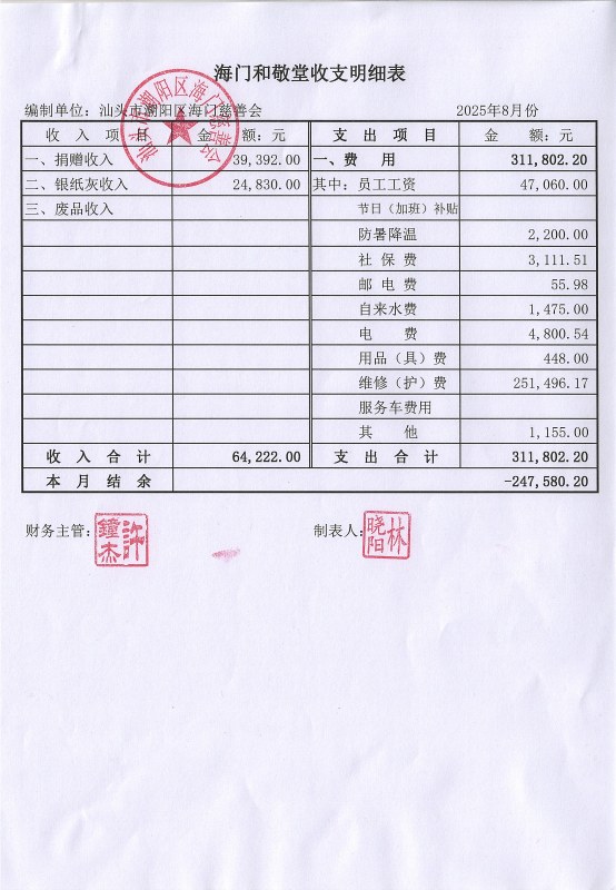 2025年8月份和敬堂收支明细表