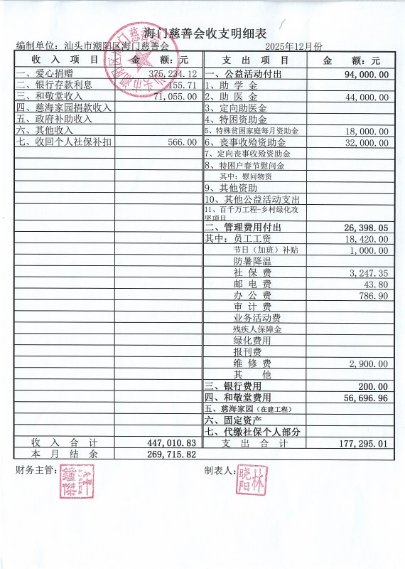 海门慈善会2025年12月份收支明细表