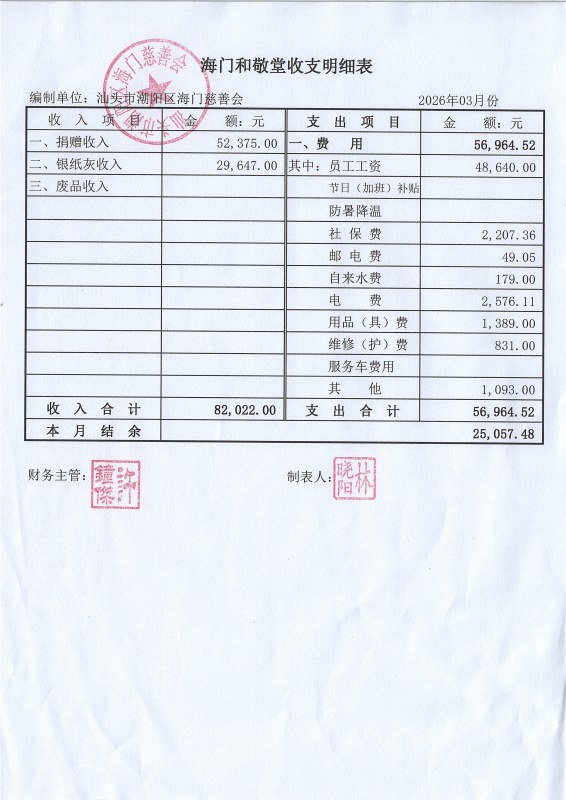 2026年3月份和敬堂收支明细表